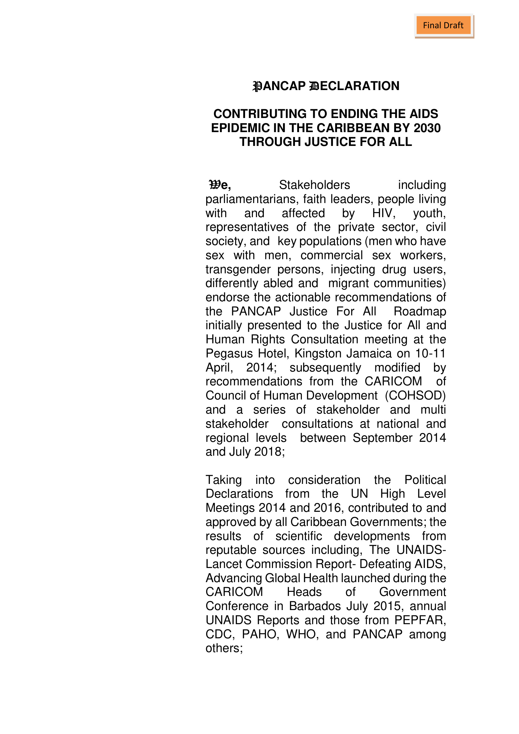 The PANCAP Justice for All Roadmap outlines regional strategies to remove legal and social barriers to HIV services and reduce stigma and discrimination affecting key populations in the Caribbean.
